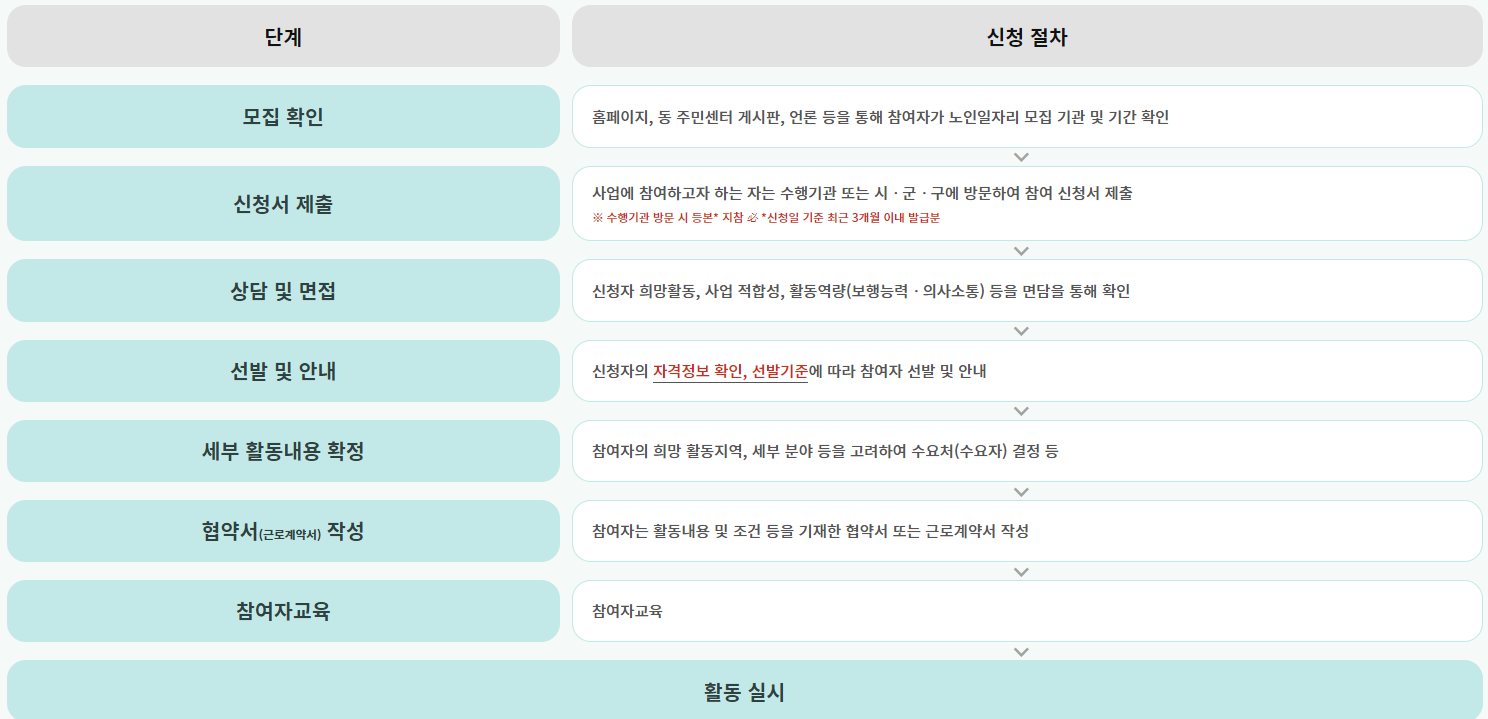 가까운 노인복지관이나 시·군·구청, 읍·면·동 주민센터에서도 직접 신청이 가능합니다. 신청서를 제출하고 자격 심사를 거쳐 일자리에 배정됩니다.