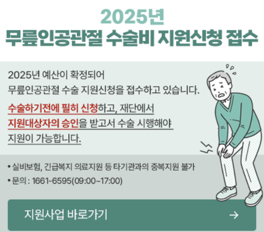 무릎 인공관절 수술 지원은 보건복지부에서 지정한 병원에서만 가능합니다. 지정 병원이 아닌 곳에서 수술할 경우 비용 지원이 불가능합니다. - 지원 한도 초과