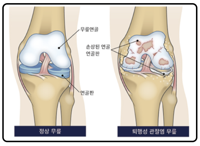 무릎 퇴행성관절염은 관절의 연골이 손상되고, 관절 주위의 뼈와 조직이 변화하는 질환입니다.